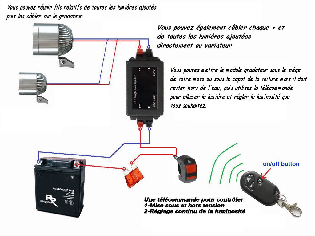Autrement schéma prévu tout simple, qui peut permettre d'allumer les LED sans le contact pour bouger la moto dans le noir par exemple et à distance avec la télécommande