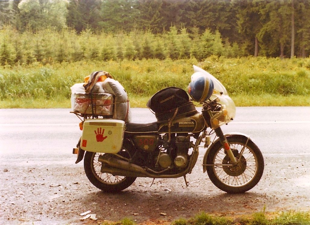 - la Honda CB125 + la CB 500 en partance seul pour la Sardaigne ! Puis la R75 idem mais en voyage de noces ! Admirez les valises et top case de l'époque !
