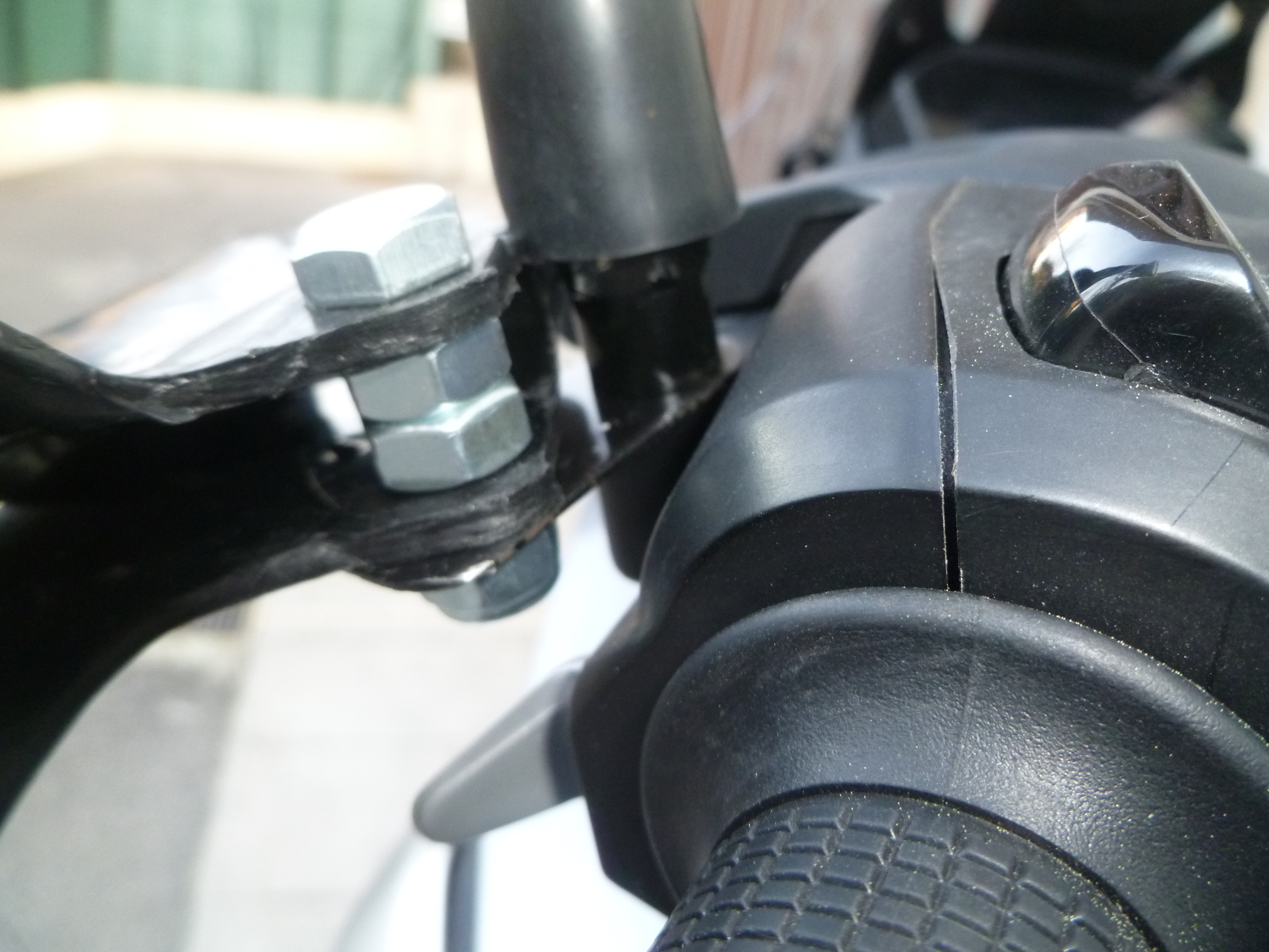 1 trou pour le rétro, 1 trou pour le boulon de liaison patte/protège-main (diamètre 8 mm, L. 30 mm), un coup de bombe noire pour la mise en couleur, deux écrous (par protège-main) servant d'entretoises, 1 rondelle, 1 écrou frein-filet pour bloquer l'ensemble.