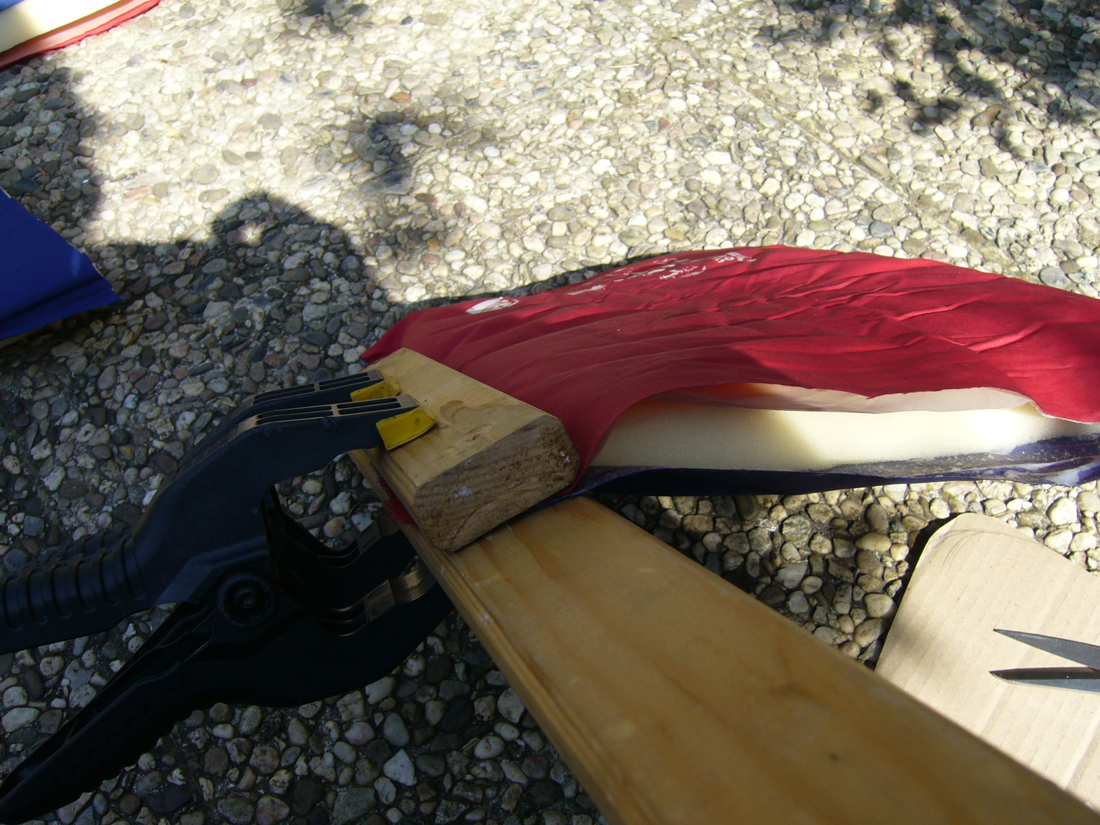 Le truc bleu à l'avant est un bout de tapis de gym resté là... Pour un premier essai, il couvrait tout le coussin, mais c'était trop ferme. (Je crois que Clod a trouvé la bonne mousse, un tapis assez récent, plus souple, élastique )
