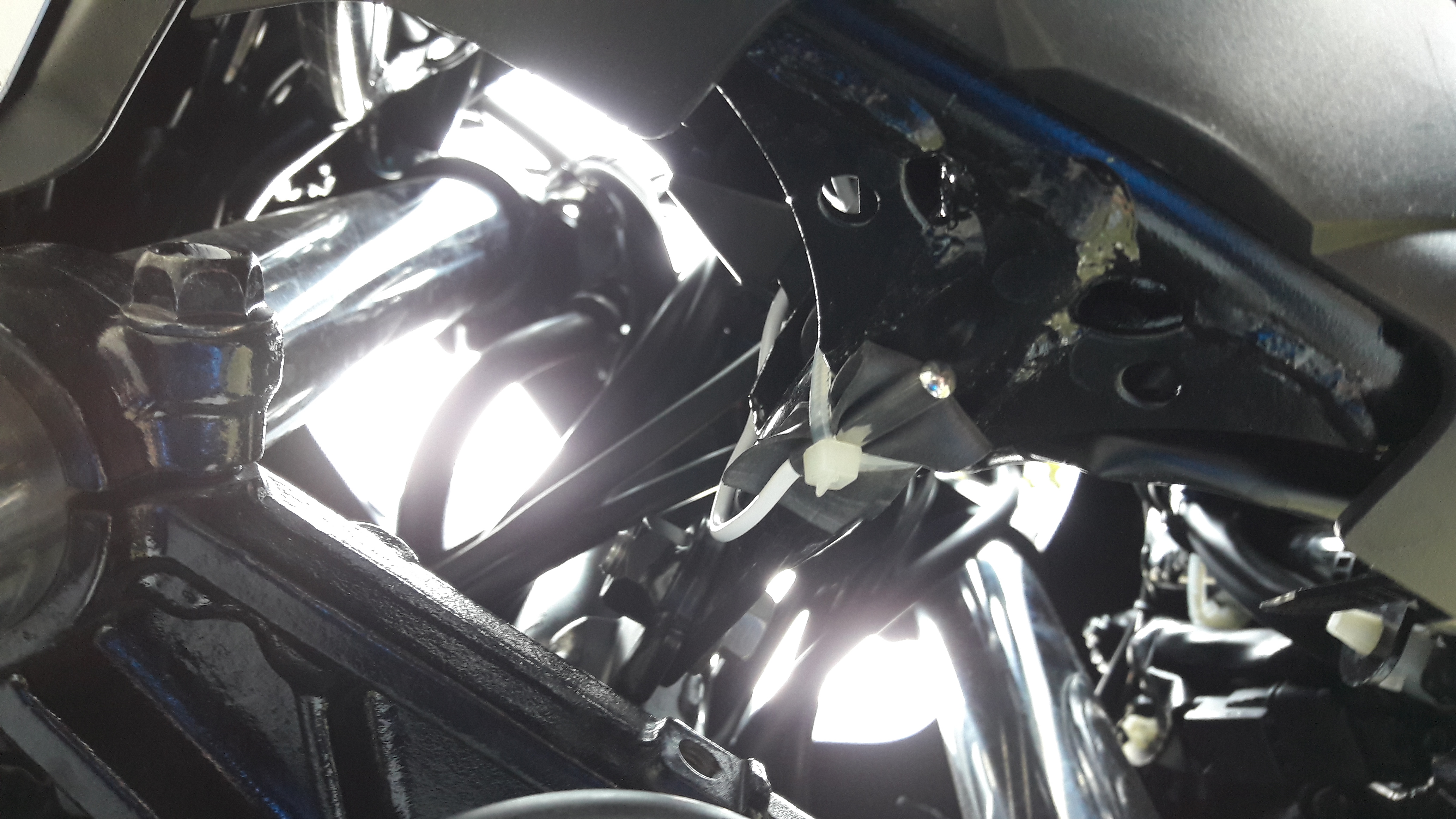 Capteur mis plus bas, la où se fixent les crash bar, j'ai pas mis sous le bec pour être sur de pas le voir. Et j'ai réussi à rentrer le reste du fil derriere une plaque en métal, donc c'est plutôt bien caché. J'ai mis un bout de chambre à air pour pas que ce soit en contact avec le métal et fausse la mesure (même si je sais pas si c'est vraiment utile).
