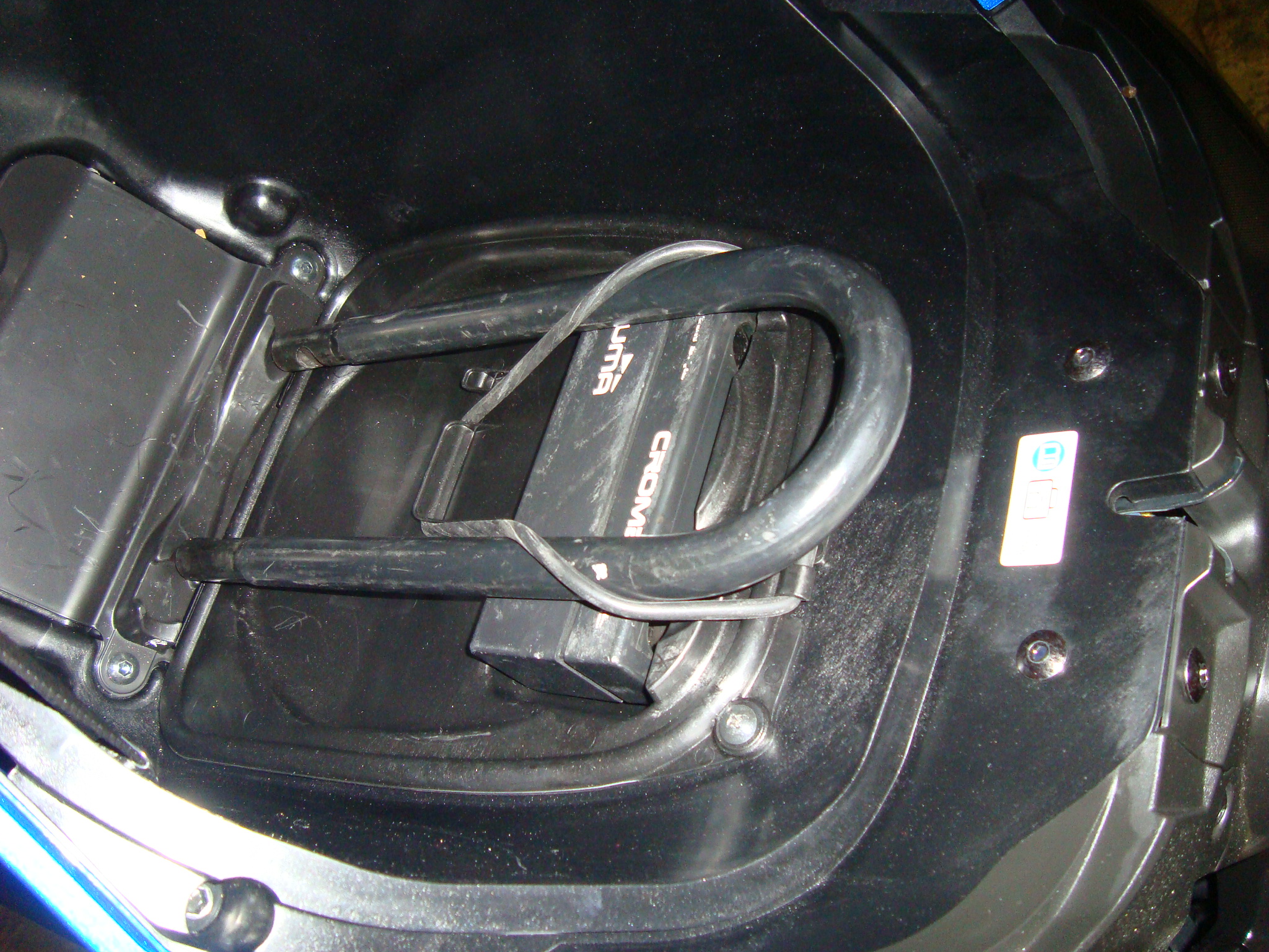 Avant, voir mon message du 28 Nov 2015 19:06 en fin de page 2 de cette discussion, la partie avec la serrure prenait place dans le petit logement du manuel de la moto. Dans le fond du coffre ce n’était pas bien pratique, il fallait le vider pour y accéder.