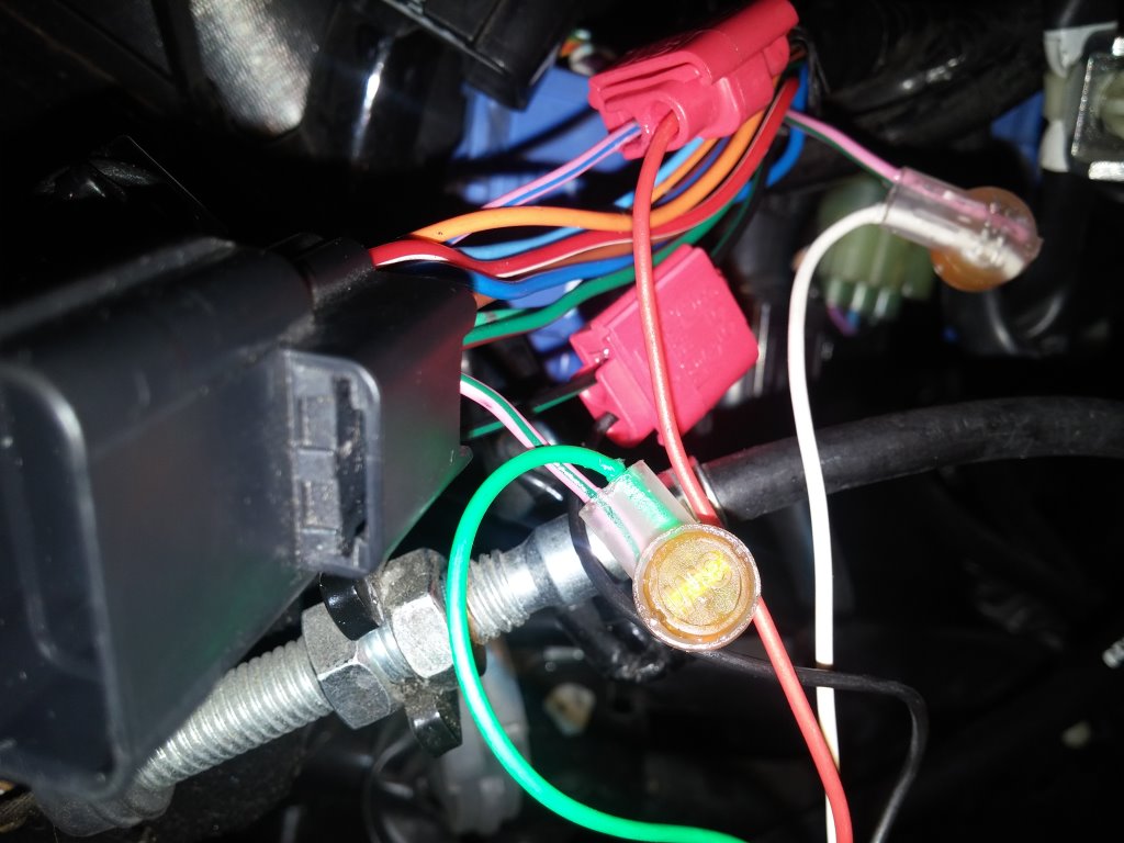 Connecter (avec les prises rapides rouges fournies) le fil vert du faisceau du Speedo sur le fil rose/vert coupé coté connecteur du tableau de bord.
