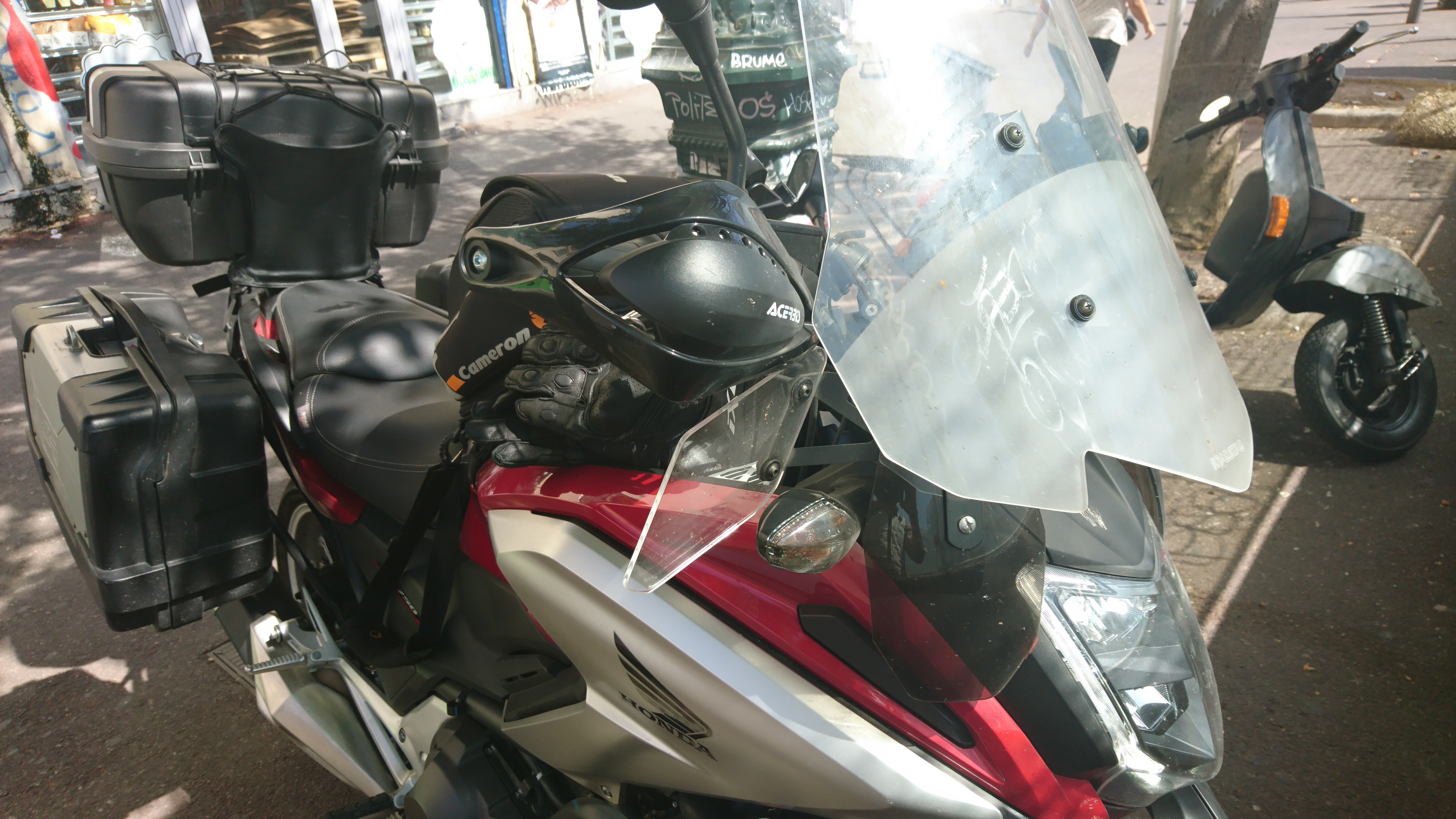 À noter j'ai dû virer les parmain Givi et ..monter des Acerbis qui ne sont fixés que par l'embout de guidon que j'ai aussi du retirer ça n'était pas compatible, pas de guidonnage ou vibrations, mais ainsi les paremains sont souples et peuvent passer au-dessus des déflecteurs, petit bonus ces Acerbis sont équipés de led, sur piles AAA dans un petit boîtier côté intérieur, un petit bouton permet de les allumer, sympa car quand le contact est coupé ça éclaire un peu le garage, ça dépanne.