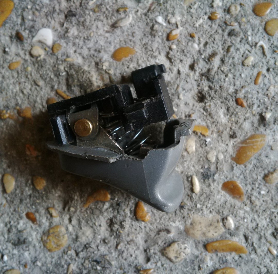 Pas de rappel, ressort inefficace ? Partie grise désolidarisée de l'articulation métallique (c'est "collé") ?
