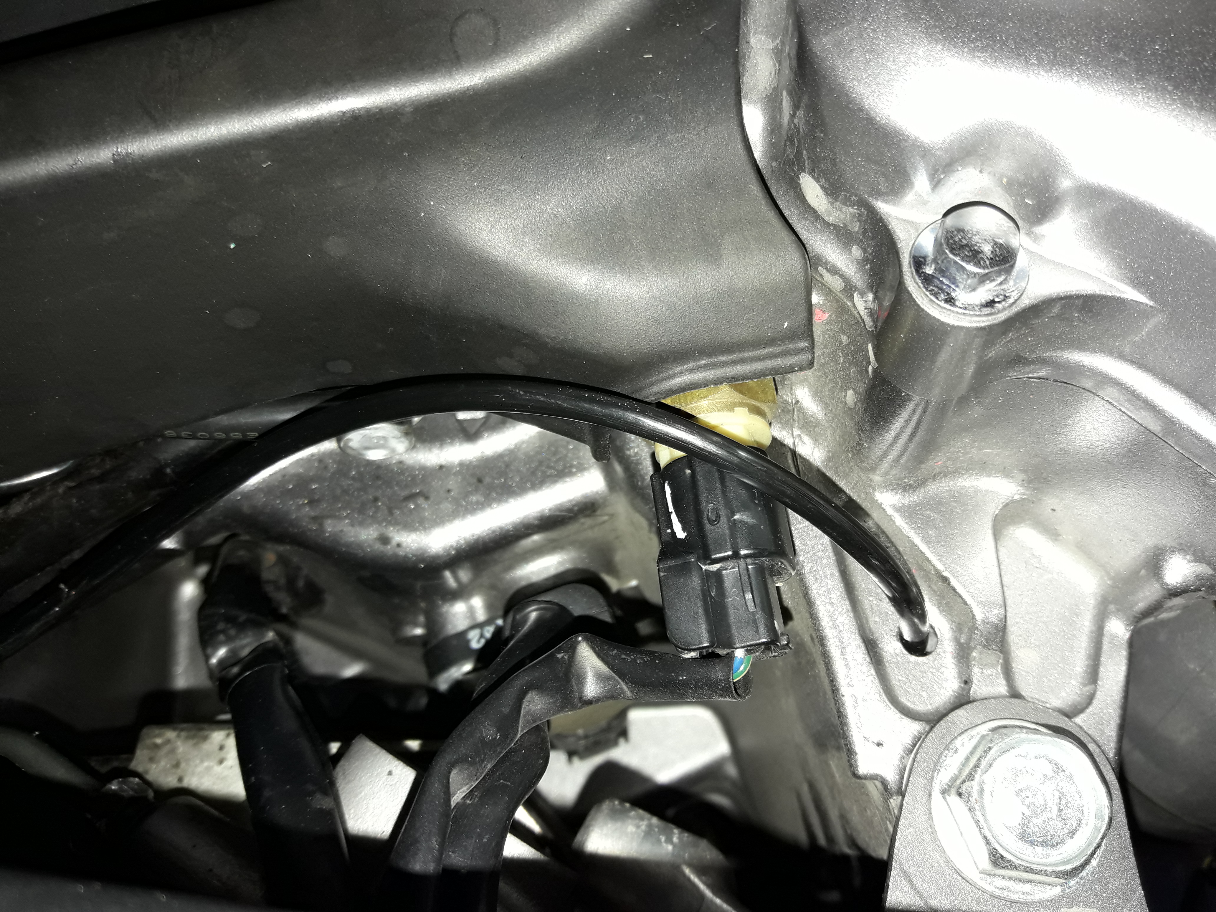 Installation du réservoir sur la seconde vis de carter, à droite. Plus bas, le réservoir touche le protège carter en plastique, plus haut le coude du tuyau est plus marqué, et on a moins de place pour remplir le réservoir.