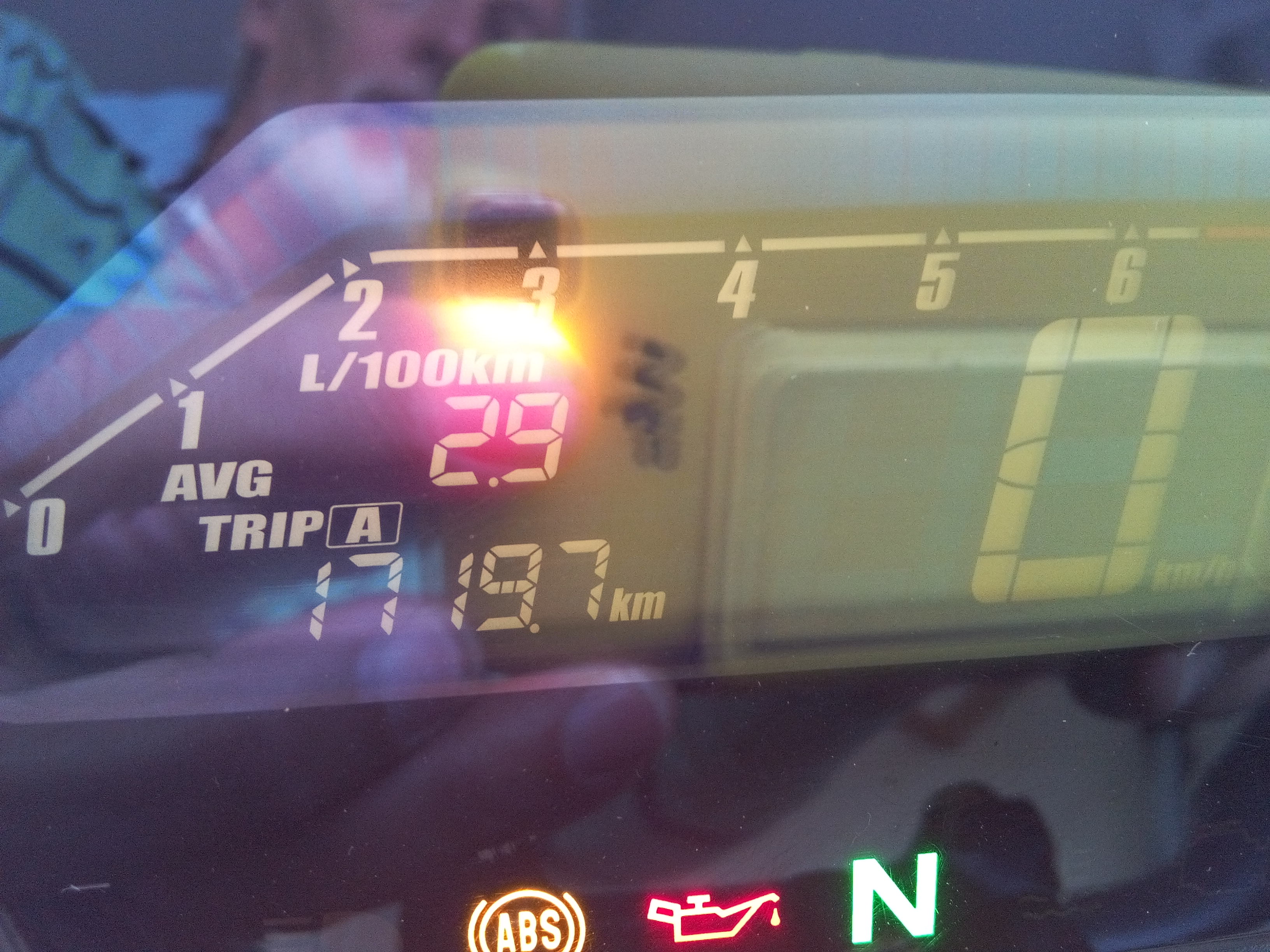 En s'amusant à pousser la moto ? Parce que sinon je ne vois pas comment descendre à 2,9. J'arrive péniblement à 3,6 en trajet quotidien et alors dès que je pars en voyage jouer sur des petites routes c'est plus de 4 ;)