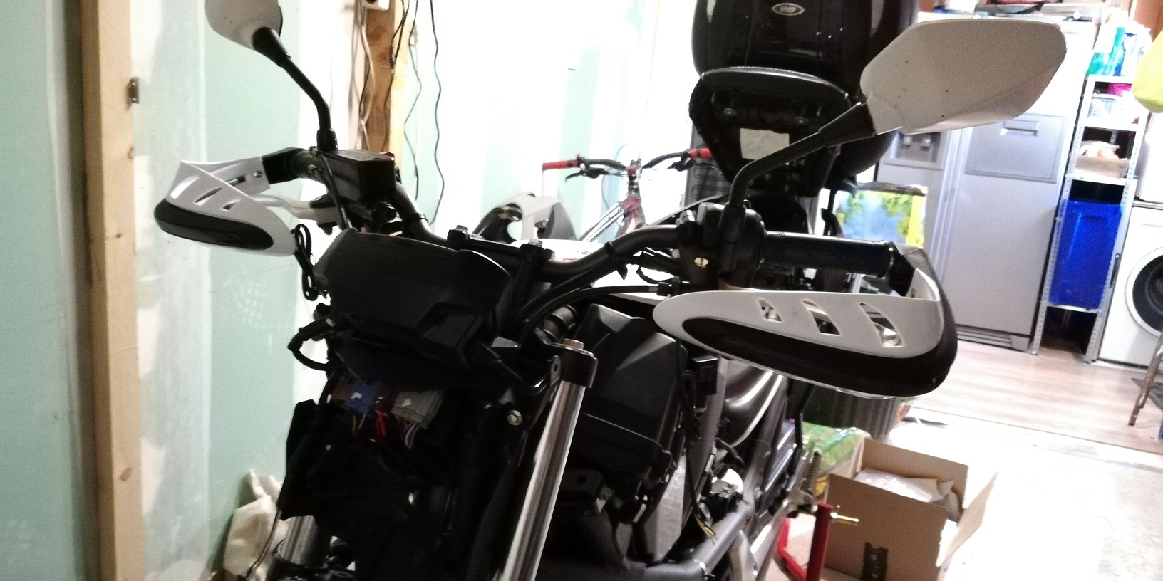 Honda NC700S DCT remplacé par un Suzuki V-Strom 650 M1 et toujours mes manchons Givi pour garder les mimines au chaud l'hiver