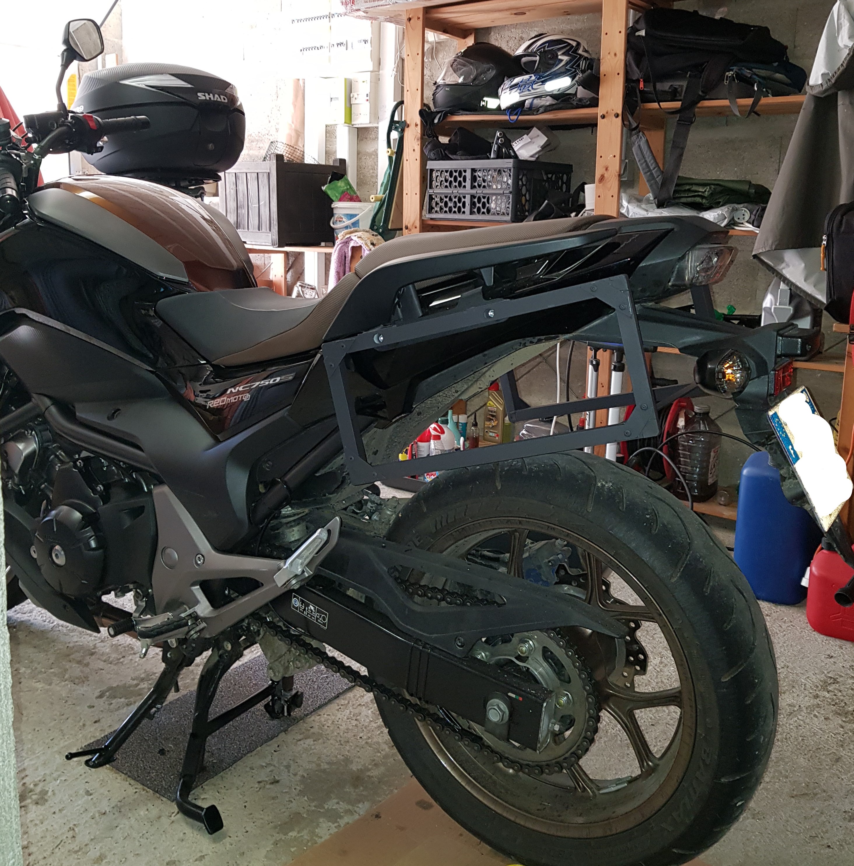C'est un beau (au sens effort) bricolage mais perso quitte à faire ça je pars sur le support Givi + valises en dur, moins visible, encore plus pratique (pas besoin d'enlever pour le plein et étanche), même si un poil plus cher.