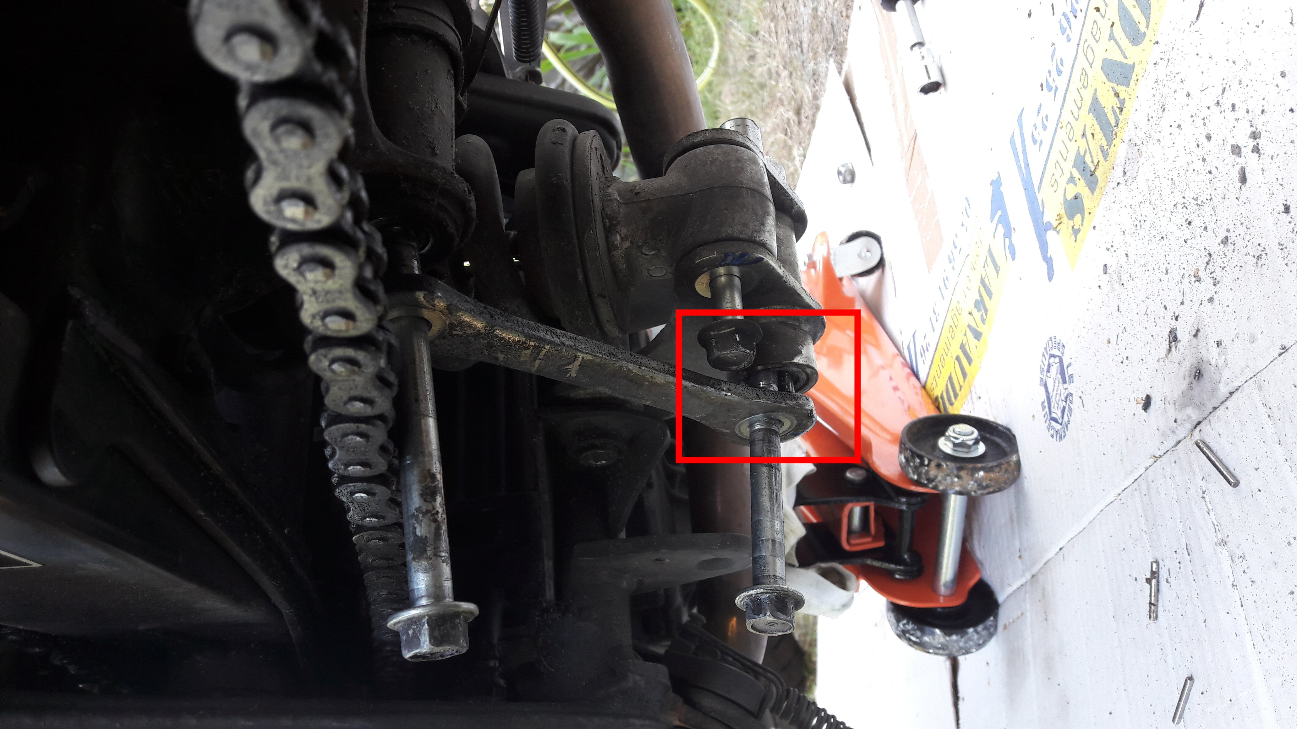 Sans succès. C'est l'assiette de la moto qui travaille. La roue arrière ne se lève pas d'un millimètre. Du coup ça ne soulage pas pour libérer les longues vis. L'arrière a besoin d'être levé d'un point plus haut, genre poulie.