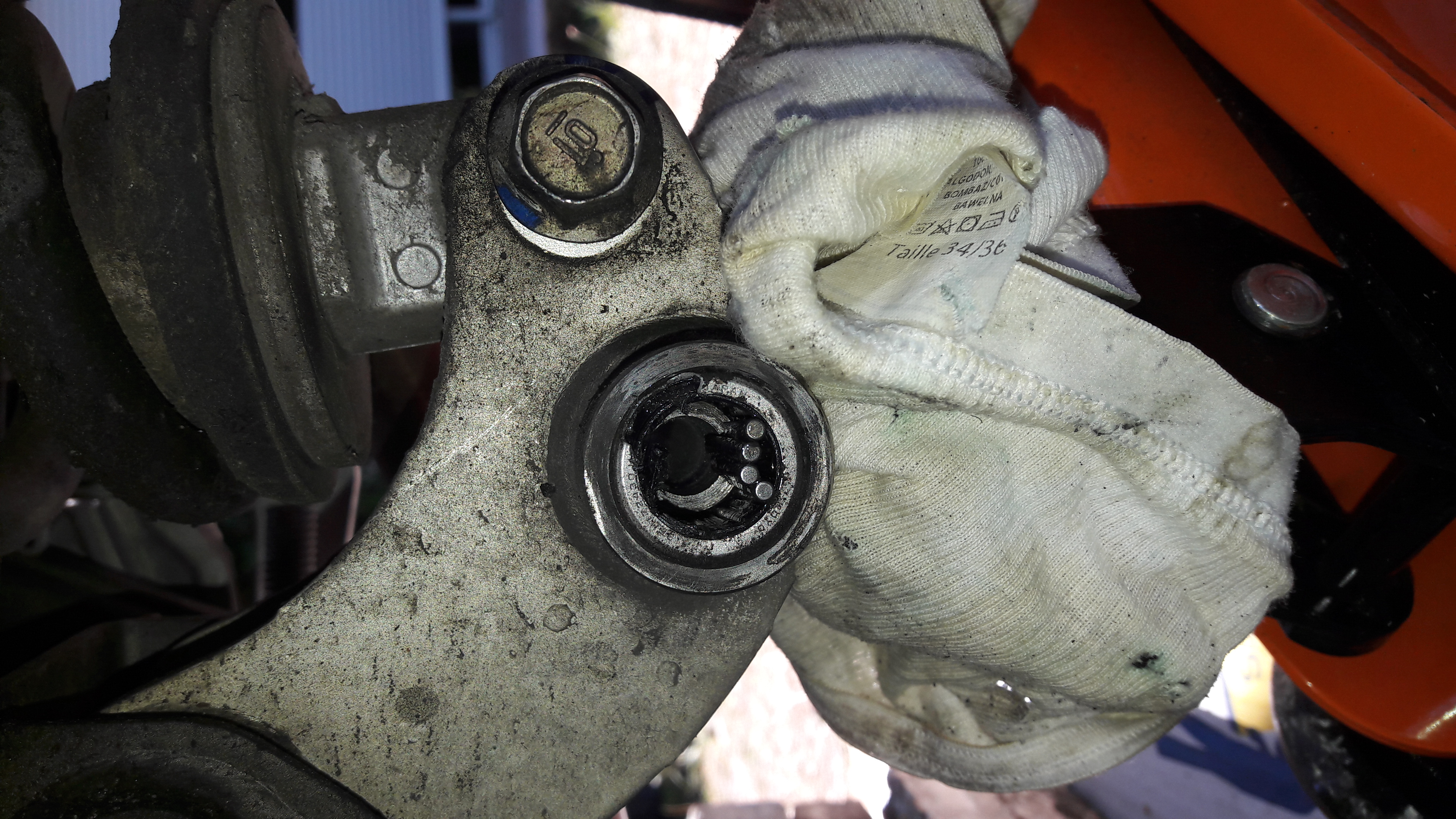 De ce fait (ce n'est pas une surprise) la cage du bas a souffert comme on peut le voir ci-dessous. Après nettoyage des aiguilles, graissage (généreux) remise en place des aiguilles et du joint d'étanchéité que j'ai décalé afin d'optimiser au maximum son efficacité. Puis, repositionnement du collier. Enfin, hier matin j'ai sollicité un voisin (qui roule en R 1250 RS) pour maintenir la vis afin de resserrer les écrous pour passer la partie filetage frein filet. Les poignées de ma petite chérie n'arrivant pas à résister le passage un peu en force.