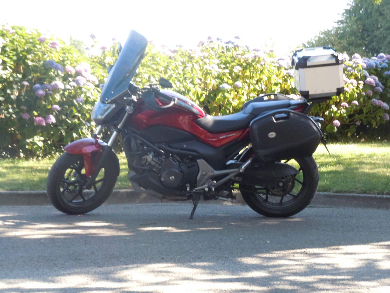NC750X DCT 2016 - bulle haute Puig avec extension, protège-mains et huileur de chaine AliE, porte-bagage et topcase Honda, valises Shad SH23, SH36. Et aussi R100RT, SR500, CB350...