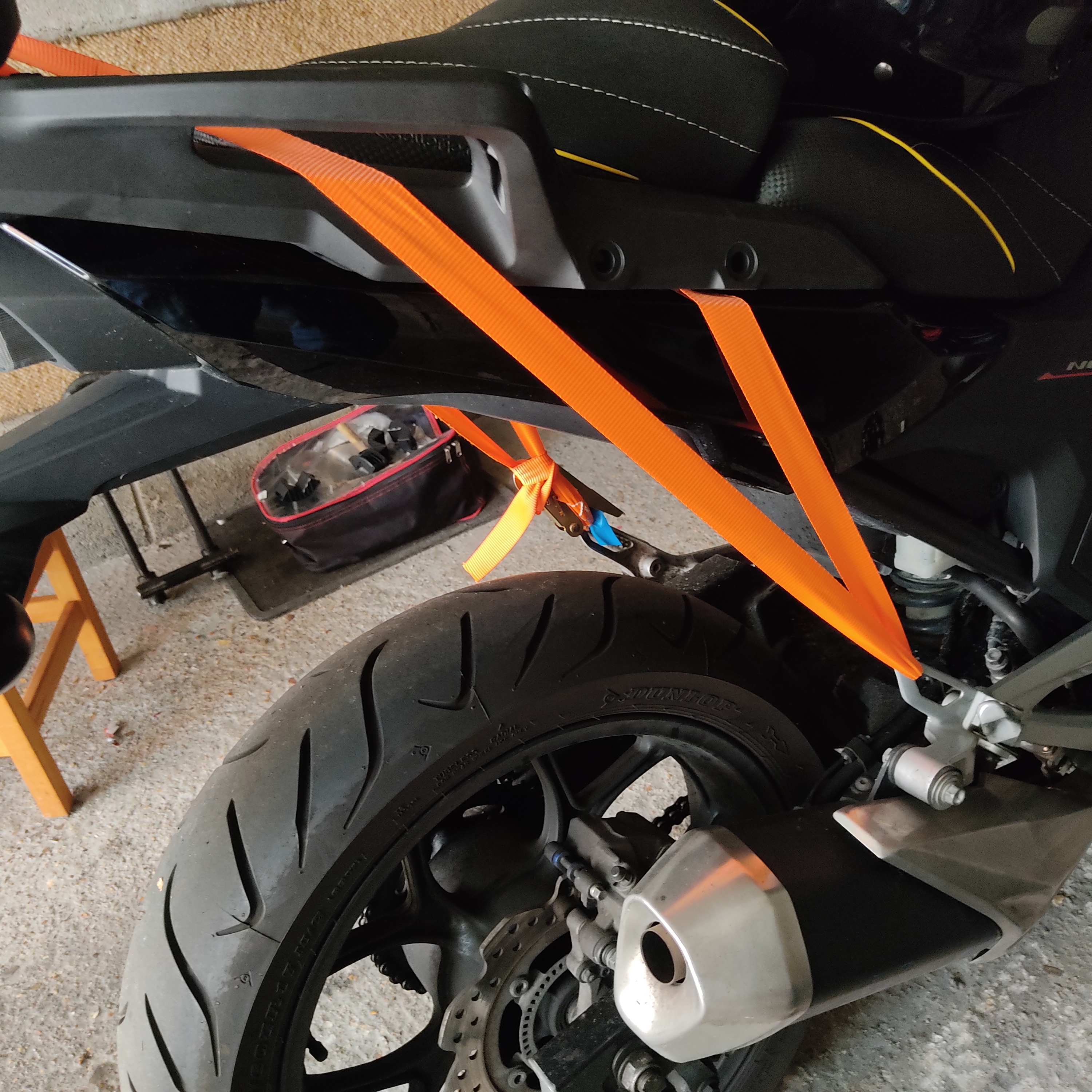 Bravo pour cette lumineuse idée, qui s'installe et se désinstalle en un tour de main, se range dans une poche, à la portée de toutes les bourses, qui n'écarte pas exagérément les sacoches, capable de supporter des charges que la boucle AR de la moto ne supportera pas, et qui sert pour bien d'autres utilisations (comme attacher en même temps un sac de selle) !